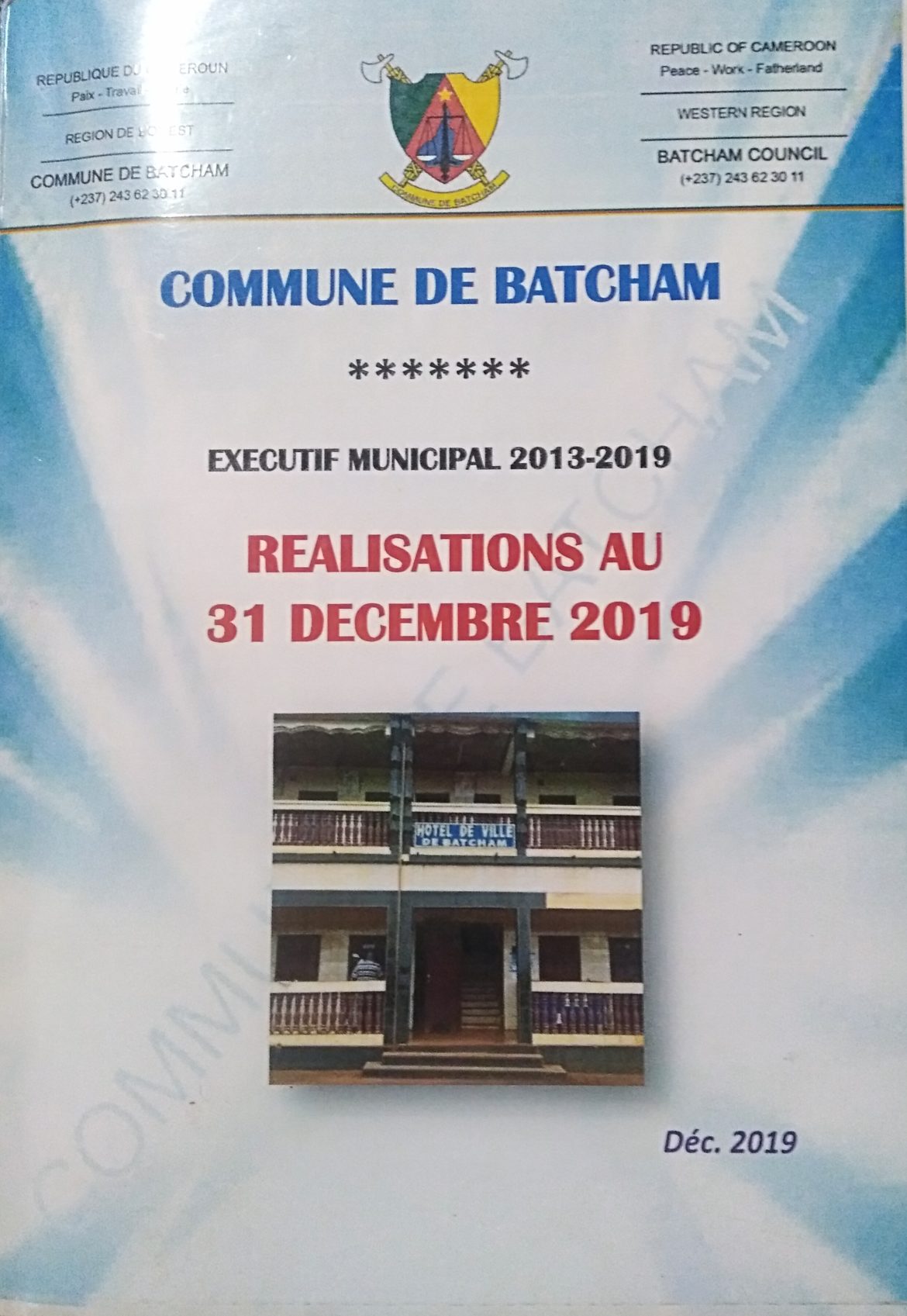 Un document, de 51 pages au format A5, de l’Exécutif municipal 2013-2019 de le Commune de Batcham, sous le mandat du Maire Paul Kenne, rend compte, en détails, et par Groupement (Chefferie Supérieure) des Réalisations au 31 décembre 2019.