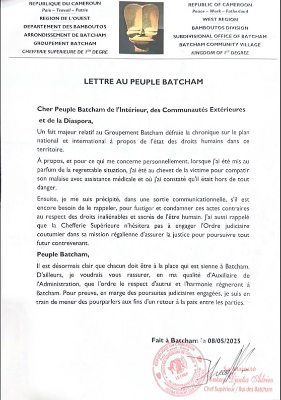 Actes et MessagesChefferie SupérieureCommunautésGroupement BatchamNotabilitésRoyaume Patsoon Communiqué du Chef Supérieur Batcham contre les actes de violence by Hiatsoon 01 9 mai 2025 written by Hiatsoon 01 9 mai 2025 0 comments 19 Share 0 FacebookTwitterPinterestThreadsBlueskyEmail Hiatsoon 01 Administrateur previous post Comite Technique d’Organisation de la sortie officielle de Fouo Djiotsoon next post CONSEIL DE CHEFFERIES ET DIPLOMATIE You may also like Décision royale portant réglementation des titres traditionnels et coutumiers dans le Groupement Batcham 17 août 2025 Entretien avec Sa Dignité Foagam Nogning Serge, Chef de la Communauté Batcham de Douala... 8 août 2025 Entretien avec Sa Dignité Tchinda Maurice, Chef de la communauté Batcham d’Ebolowa 8 août 2025 Entretien avec Sa Dignité Tatang Mbogning Robert, Chef de la Communauté Batcham de Yaoundé... 8 août 2025 Nouvelle Notabilité Batcham : Entretien avec Ndeh Shoufouo’o Mba’a DJUINNOU Gaslan 8 août 2025 Nouvelle Notabilité Batcham : Entretien avec Mo’o Mafouo Tchouté 8 août 2025