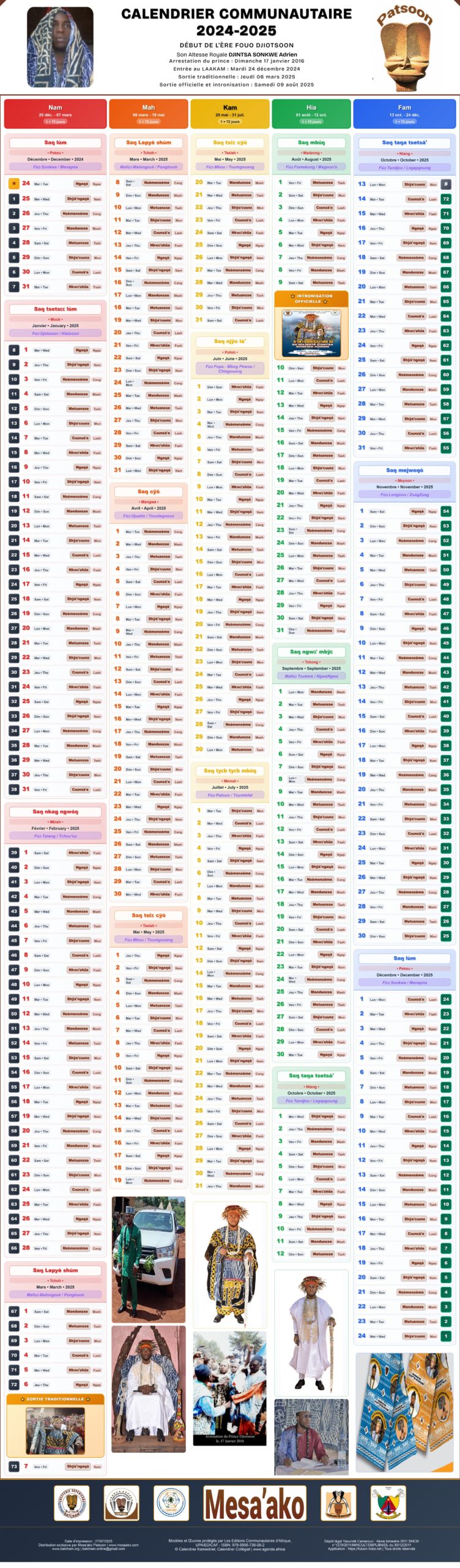 A ProposA Propos des Patsoon BoongActualitéAgendaAstuces et BricolagesAu QuotidienBon à savoir !Carte PostaleCulture et PatrimoineGénéalogie des SouverainsMeenNgiemboonOrganistationReligionRépertoireRessourcesSociété Calendrier : An 1 de l’ère Fouo DJIOTSOON by Hiatsoon 01 8 août 2025 written by Hiatsoon 01 8 août 2025 0 comments 85 Share 0 FacebookTwitterPinterestThreadsBlueskyEmail Hiatsoon 01 Administrateur previous post Entretien avec Sa Dignité Foagam Nogning Serge, Chef de la Communauté Batcham de Douala et ses Environs – COBADE next post Décision royale portant réglementation des titres traditionnels et coutumiers dans le Groupement Batcham You may also like Décision royale portant réglementation des titres traditionnels et coutumiers dans le Groupement Batcham 17 août 2025 Entretien avec Sa Dignité Foagam Nogning Serge, Chef de la Communauté Batcham de Douala... 8 août 2025 Le CODEGBA de nouveau en marche 8 août 2025 Entretien avec Sa Dignité Tchinda Maurice, Chef de la communauté Batcham d’Ebolowa 8 août 2025 Entretien avec Sa Dignité Tatang Mbogning Robert, Chef de la Communauté Batcham de Yaoundé... 8 août 2025 Nouvelle Notabilité Batcham : Entretien avec Ndeh Shoufouo’o Mba’a DJUINNOU Gaslan 8 août 2025