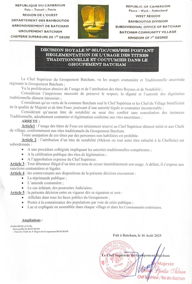 Article 1er : L’usage des titres de Fouo est strictement réservé au Chef Supérieur dûment initié et aux Chefs de Village, conformément aux rites traditionnels du Groupement Batcham.